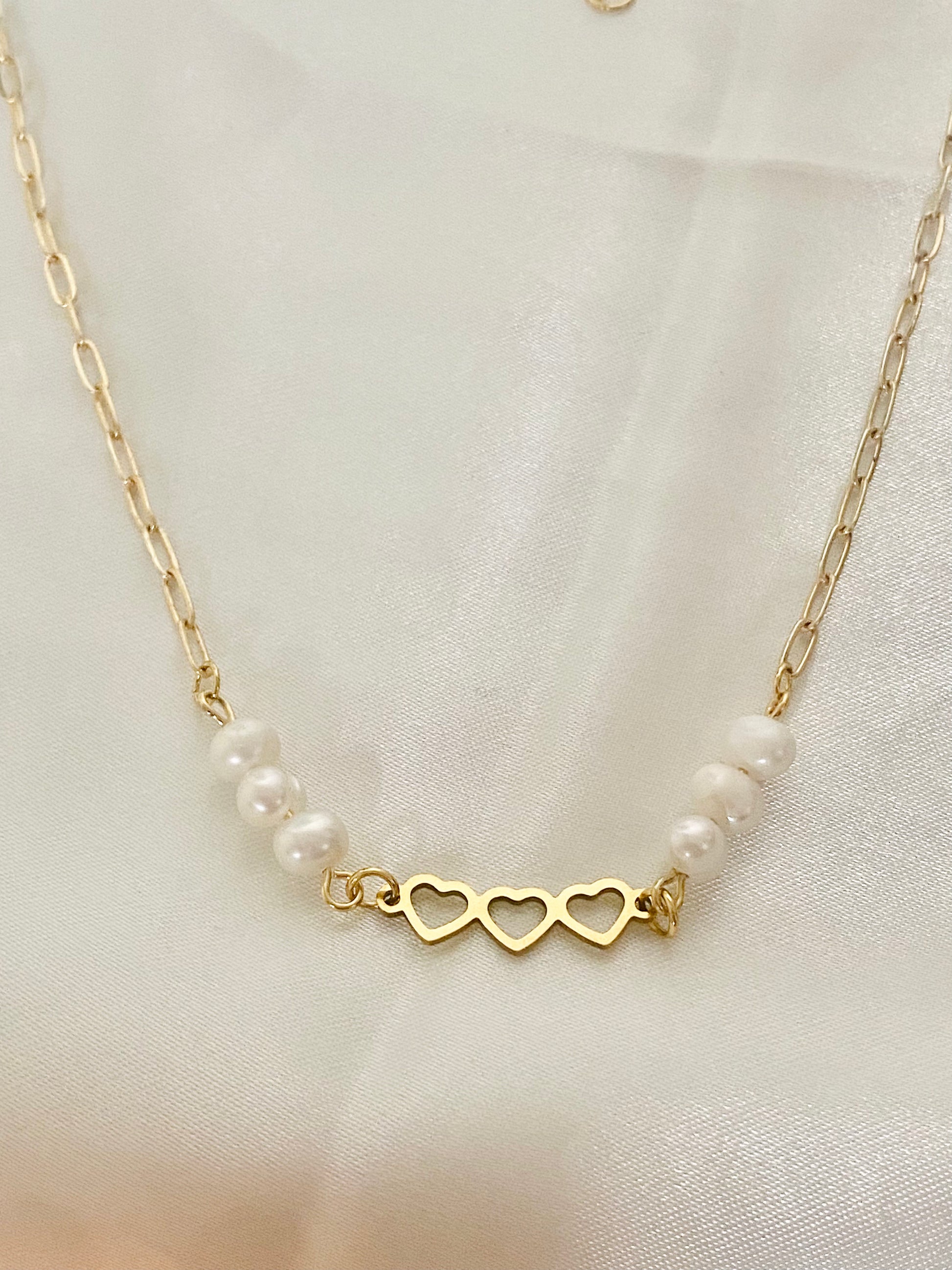Le collier JAZIA est fait à la main avec des perles d'eau douce. Il est fini par un pendentif trio en forme de coeur, relié à une chaîne de trombone. Offrez à votre style un look romantique et tendance!