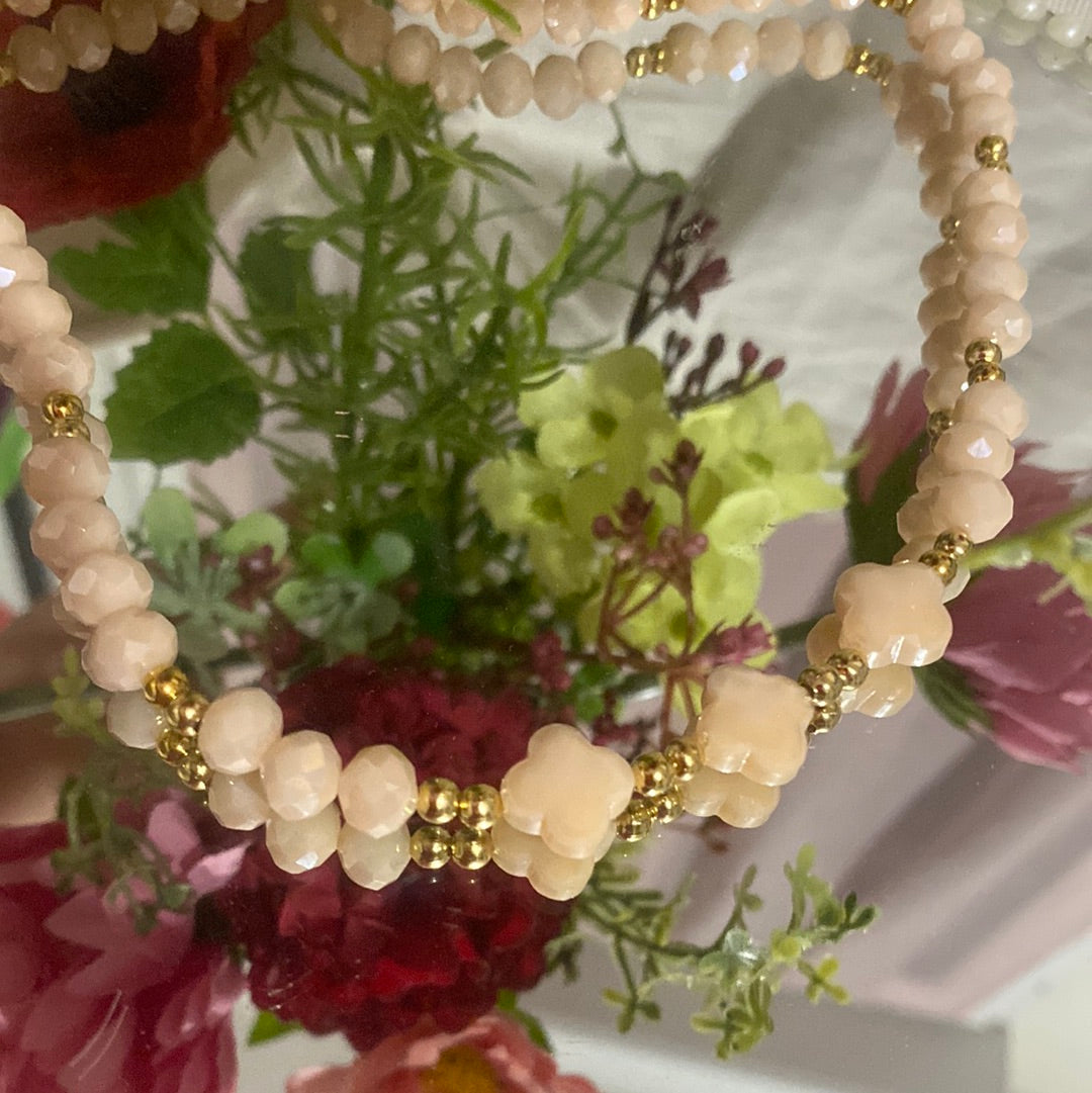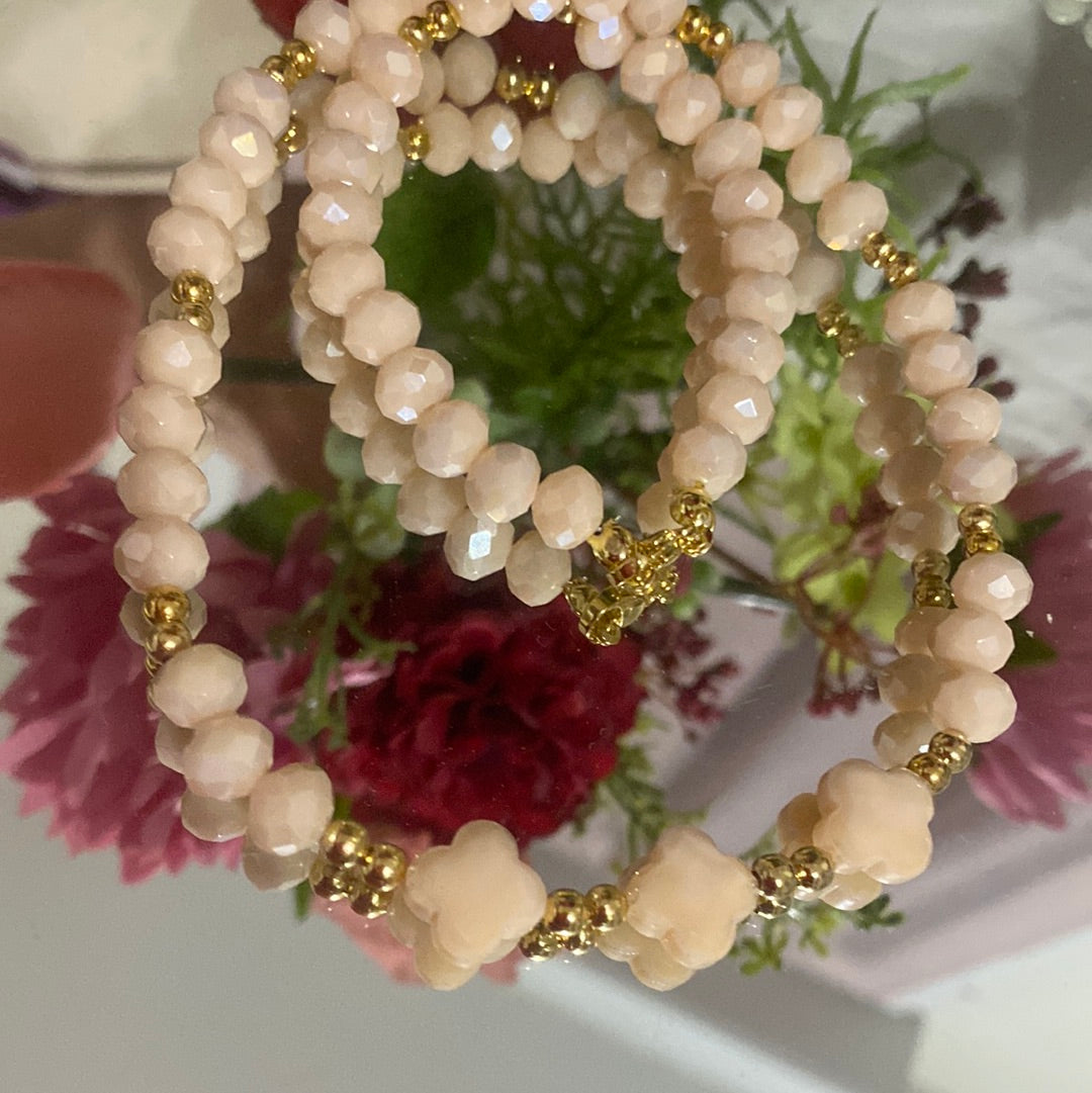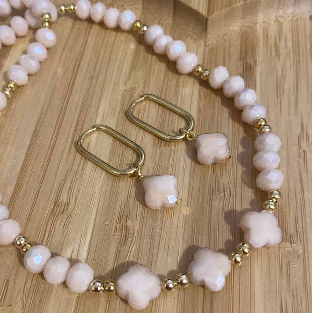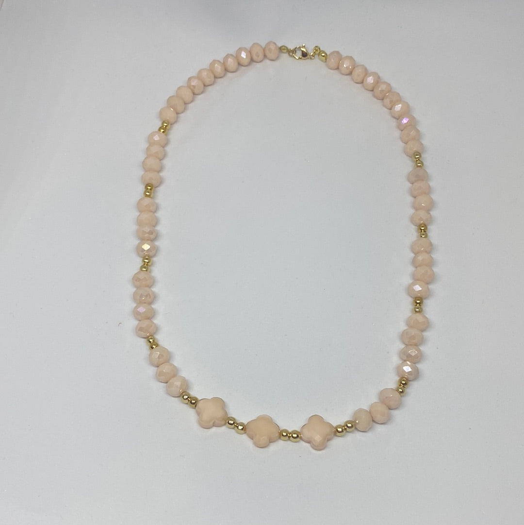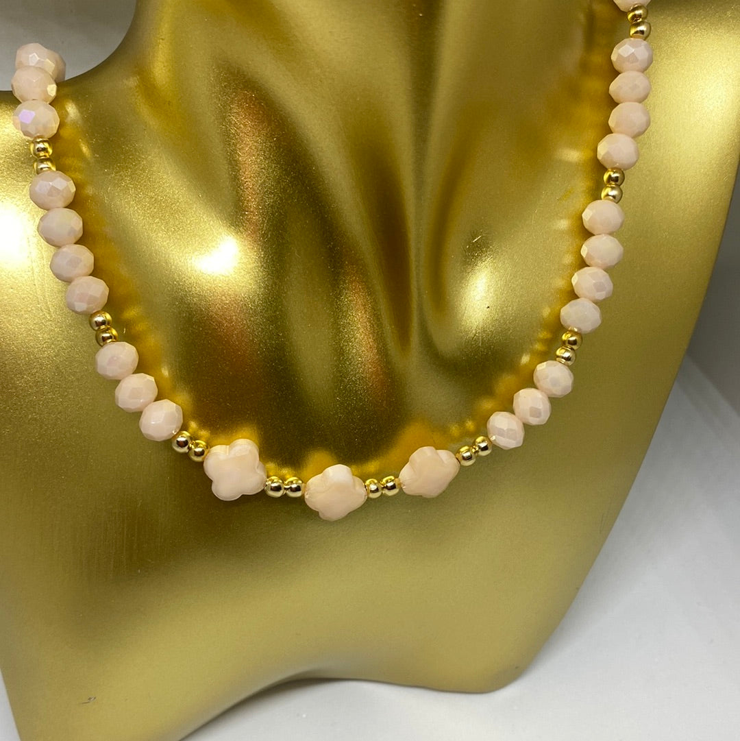 Collier en perle cristal à facettes. fait main avec trois trèfles en perle de verre ainsi que des perles en verre plaqué or